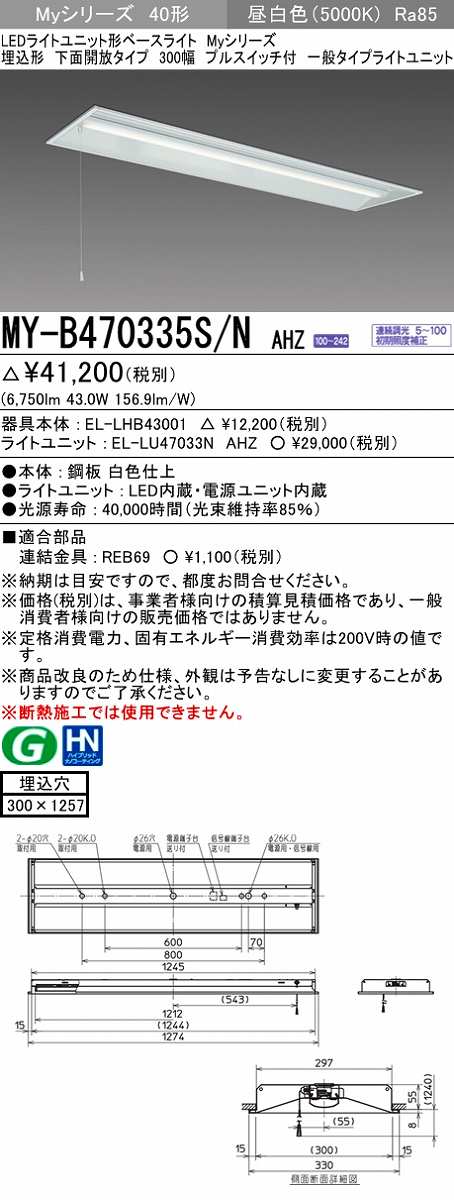 三菱 MY-B470335S/N AHZ LEDライトユニット形ベースライト 埋込形下面開放300幅プルスイッチ付 一般 初期照度補正付連続調光 昼白色 受注生産品 [§]