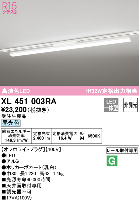 オーデリック XL451003RA ベースライト 非調光 LED一体型 昼光色 レール取付型 オフホワイトプラグ 受注生産品 [§]