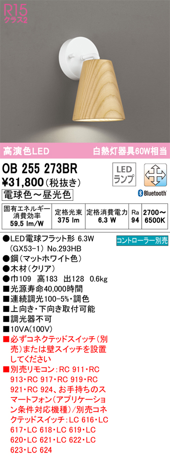 オーデリック OB255273BR(ランプ別梱) ブラケットライト 調光 調色 Bluetooth コントローラー別売 LEDランプ 電球色〜昼光色 クリア