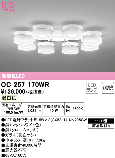 オーデリック OC257170WR(ランプ別梱) シャンデリア 10畳 非調光 LEDランプ 温白色 マットホワイト