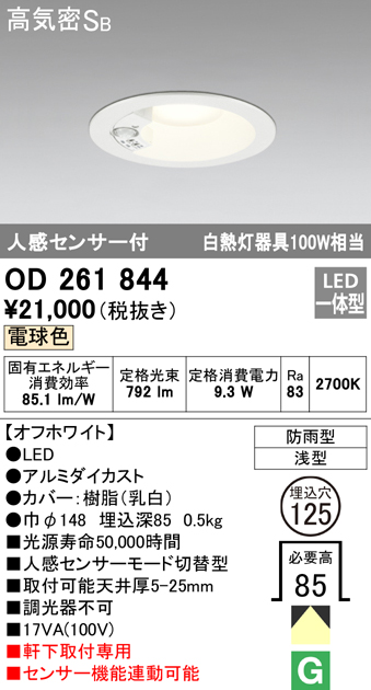 オーデリック OD261844 ダウンライト φ125 LED一体型 電球色 防雨型 浅型 高気密SB 人感センサー付 オフホワイト