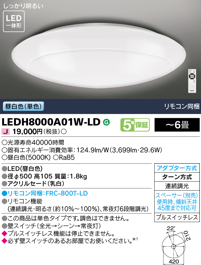 東芝ライテック LEDH8000A01W-LD シーリングライト LED一体形 昼白色 (単色) 連続調光 〜6畳 リモコン同梱 [♭]
