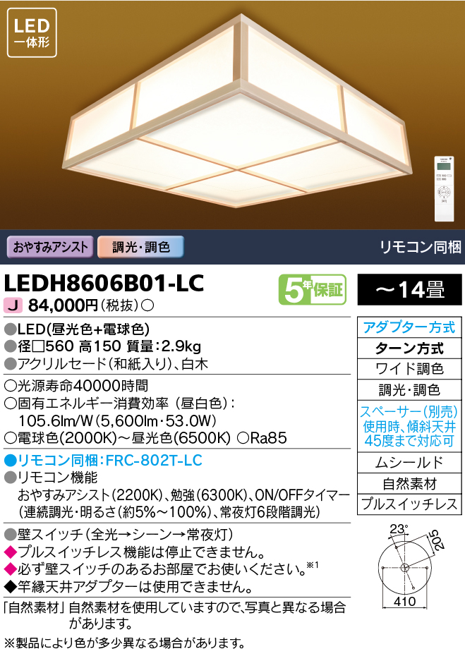 東芝ライテック LEDH8606B01-LC シーリングライト 和風照明 LED一体形 ワイド調色 調光 □560 〜14畳 リモコン同梱