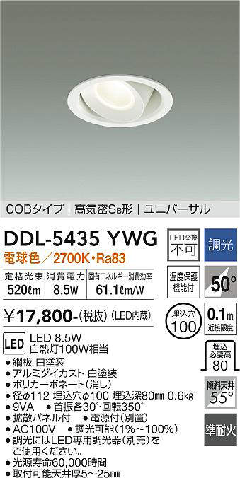 大光電機(DAIKO) DDL-5435YWG ダウンライト 埋込穴φ100 調光(調光器別売) 電球色 COBタイプ 高気密SB形 ユニバーサル 白