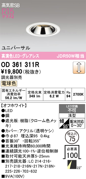 オーデリック OD361311R ダウンライト 埋込穴φ75 調光 調光器別売 LED一体型 電球色 高気密SB オフホワイト