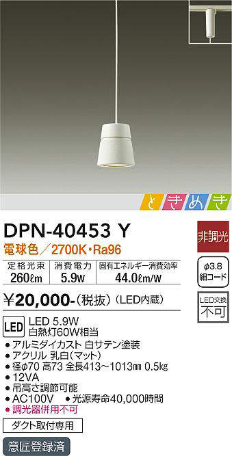 大光電機(DAIKO) DPN-40453Y ペンダントライト LED内蔵 非調光 ときめき 電球色 ダクト取付専用 ホワイト [♭]