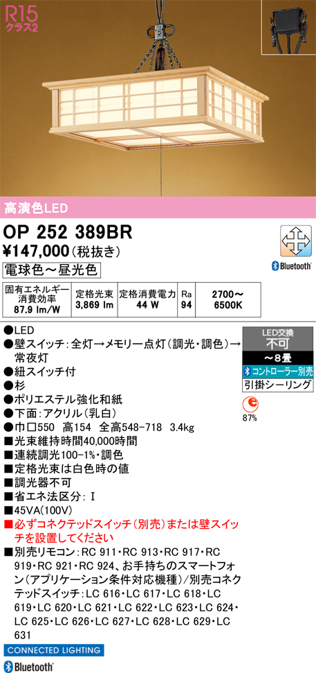 オーデリック OP252389BR 和風照明 ペンダントライト 8畳 調光調色 Bluetooth リモコン別売 LED一体型 高演色LED 引掛シーリング 木製