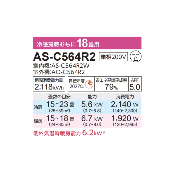 富士通 AS-C564R2 エアコン 18畳 ルームエアコン Cシリーズ ノクリア 単相200V 18畳程度 ホワイト (AS-C563N2の後継品)