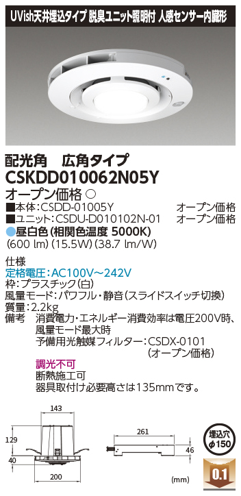 東芝 CSKDD010062N05Y ウイルス抑制・除菌脱臭用UV-LED光触媒装置 ユービッシュ 天井埋込タイプ 500シリーズ 人感センサー内蔵形 脱臭ユニット 色温度:5000K