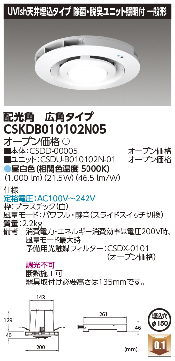 東芝 CSKDB010102N05 ウイルス抑制・除菌脱臭用UV-LED光触媒装置 ユービッシュ 天井埋込タイプ 1000シリーズ 一般形 除菌/脱臭ユニット 色温度:5000K