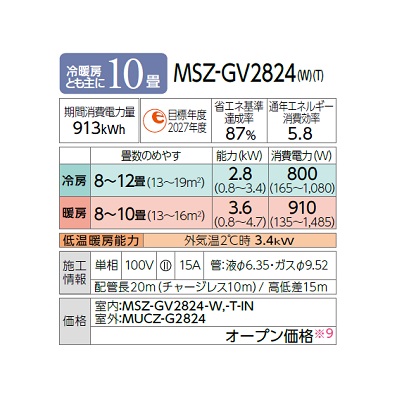 [在庫あり] 三菱 MSZ-GV2824(W) エアコン 10畳 ルームエアコン GVシリーズ 単相100V/15A 10畳程度 ピュアホワイト (MSZ-GV2823-Wの後継品) ☆2