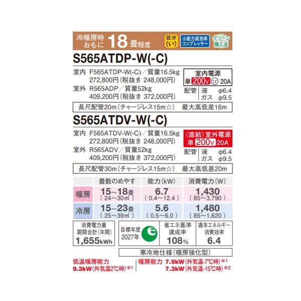 ダイキン S565ATDV-W エアコン 18畳 ルームエアコン DXシリーズ スゴ暖 室外電源タイプ 単相200V 20A 18畳程度 ホワイト (S564ATDV-W 後継品) ♪