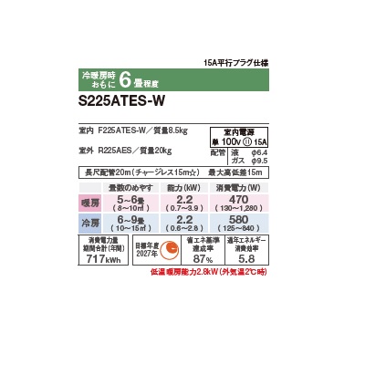 ダイキン S225ATES-W エアコン 6畳 ルームエアコン Eシリーズ 単相100V 15A 6畳程度 ホワイト (S224ATES-W 後継品) ♪