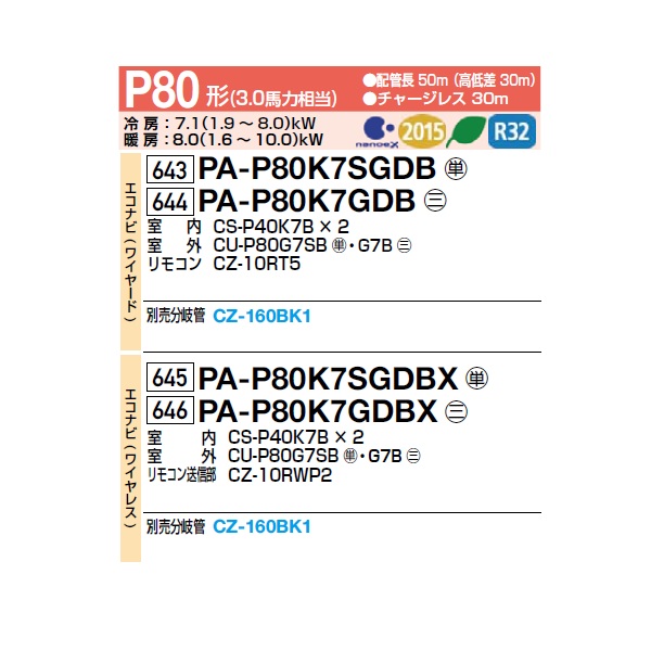 パナソニック [PA-P80K7GDBX+分岐管] 業務用エアコン 壁掛形 XEPHY Premium エコナビ(ワイヤレス) 同時ツイン P80 形3.0馬力 三相200V ♪ [戻る]