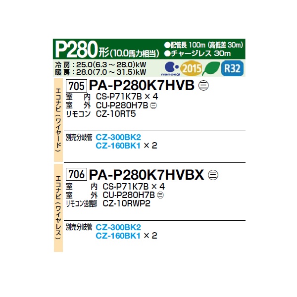パナソニック [PA-P280K7HVBX+分岐管] 業務用エアコン 壁掛形 XEPHY Eco エコナビ(ワイヤレス) 同時ダブルツイン P280形 10.0馬力 三相200V ♪