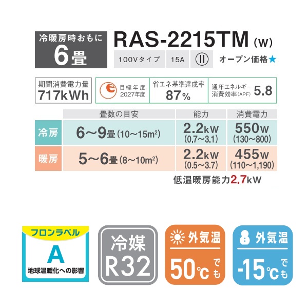 [在庫あり] 日本キヤリア/東芝 RAS-2215TM(W) エアコン 6畳用 ルームエアコン TMシリーズ 単相100V 6畳程度 ホワイト 2025モデル RAS-2215T同等品 ♭☆2