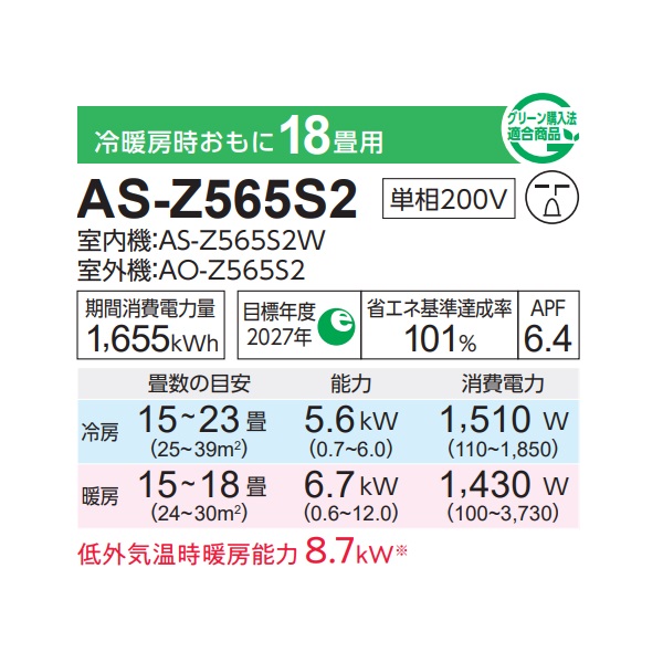富士通 AS-Z565S2 エアコン 18畳 ルームエアコン Zシリーズノクリア単相200V 18畳程度 ホワイト (AS-Z564R2の後継品) ∀