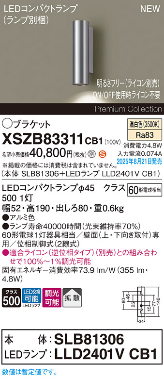 パナソニック XSZB83311CB1(ランプ別梱) ブラケット 調光(ライコン別売) LED(温白色) 壁直付型 拡散タイプ LEDコンパクトランプ交換型 アルミ色