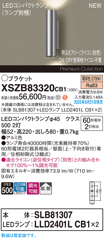 パナソニック XSZB83320CB1(ランプ別梱) ブラケット 調光(ライコン別売) LED(電球色) 壁直付型 拡散タイプ LEDコンパクトランプ交換型 アルミ色 [戻る]