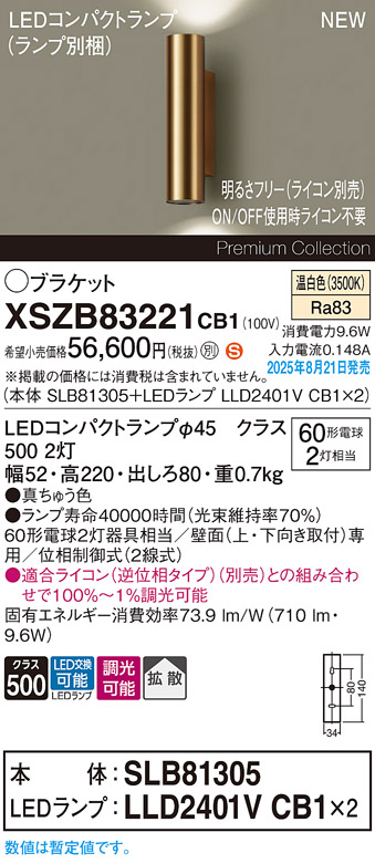 パナソニック XSZB83221CB1(ランプ別梱) ブラケット 調光(ライコン別売) LED(温白色) 壁直付型 拡散タイプ LEDコンパクトランプ交換型 真ちゅう色