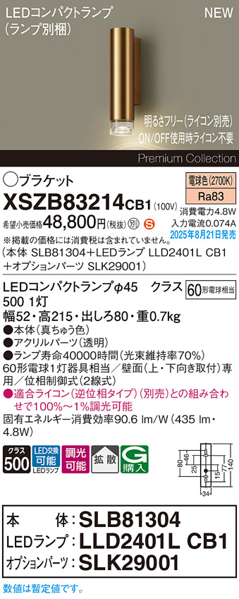 パナソニック XSZB83214CB1(ランプ別梱) ブラケット 調光(ライコン別売) LED(電球色) 壁直付型 拡散タイプ LEDコンパクトランプ交換型 真ちゅう色