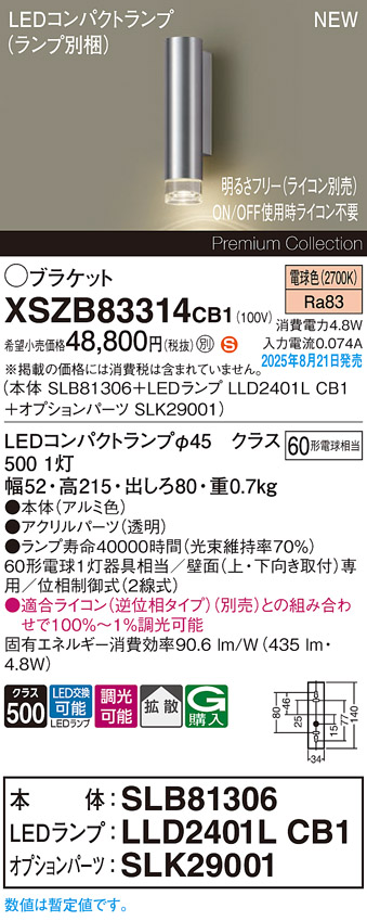 パナソニック XSZB83314CB1(ランプ別梱) ブラケット 調光(ライコン別売) LED(電球色) 壁直付型 拡散タイプ LEDコンパクトランプ交換型 アルミ色 [戻る]