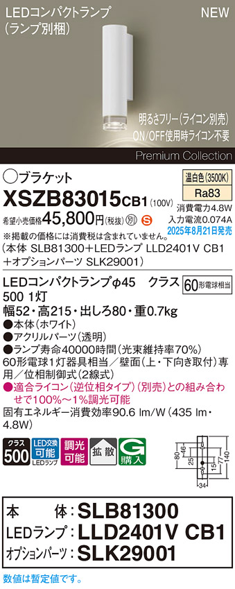 パナソニック XSZB83015CB1(ランプ別梱) ブラケット 調光(ライコン別売) LED(温白色) 壁直付型 拡散タイプ LEDコンパクトランプ交換型 ホワイト