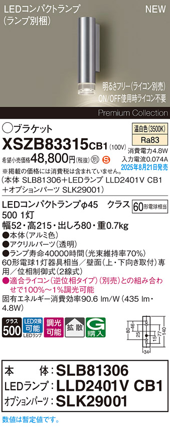 パナソニック XSZB83315CB1(ランプ別梱) ブラケット 調光(ライコン別売) LED(温白色) 壁直付型 拡散タイプ LEDコンパクトランプ交換型 アルミ色 [戻る]