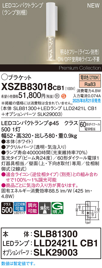 パナソニック XSZB83018CB1(ランプ別梱) ブラケット 調光(ライコン別売) LED(電球色) 壁直付型 集光24度 LEDコンパクトランプ交換型 ホワイト