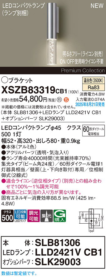 パナソニック XSZB83319CB1(ランプ別梱) ブラケット 調光(ライコン別売) LED(温白色) 壁直付型 集光24度 LEDコンパクトランプ交換型 アルミ色