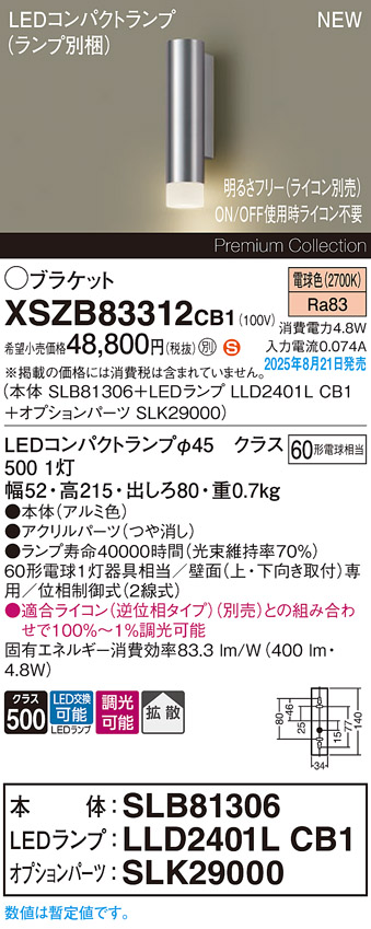 パナソニック XSZB83312CB1(ランプ別梱) ブラケット 調光(ライコン別売) LED(電球色) 壁直付型 拡散タイプ LEDコンパクトランプ交換型 アルミ色 [戻る]