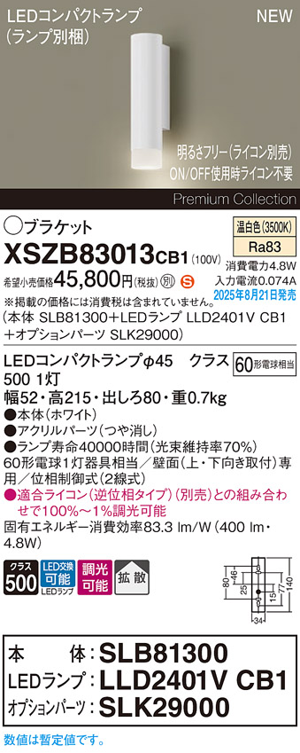 パナソニック XSZB83013CB1(ランプ別梱) ブラケット 調光(ライコン別売) LED(温白色) 壁直付型 拡散タイプ LEDコンパクトランプ交換型 ホワイト [戻る]