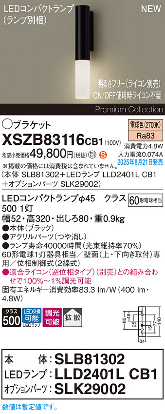 パナソニック XSZB83116CB1(ランプ別梱) ブラケット 調光(ライコン別売) LED(電球色) 壁直付型 拡散タイプ LEDコンパクトランプ交換型 ブラック