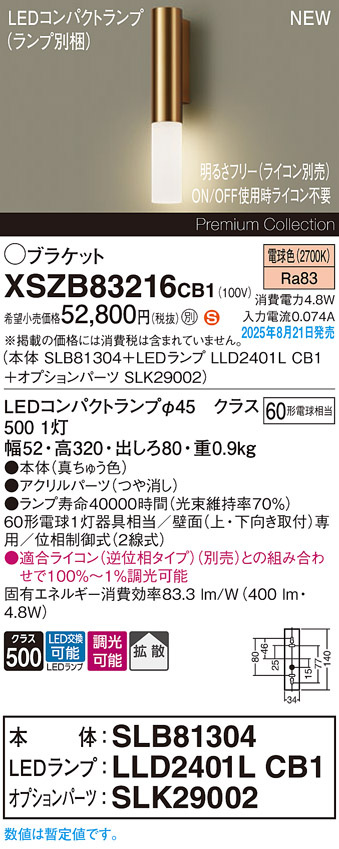 パナソニック XSZB83216CB1(ランプ別梱) ブラケット 調光(ライコン別売) LED(電球色) 壁直付型 拡散タイプ LEDコンパクトランプ交換型 真ちゅう色
