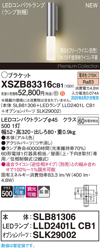 パナソニック XSZB83316CB1(ランプ別梱) ブラケット 調光(ライコン別売) LED(電球色) 壁直付型 拡散タイプ LEDコンパクトランプ交換型 アルミ色