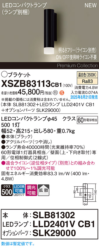 パナソニック XSZB83113CB1(ランプ別梱) ブラケット 調光(ライコン別売) LED(温白色) 壁直付型 拡散タイプ LEDコンパクトランプ交換型 ブラック [戻る]