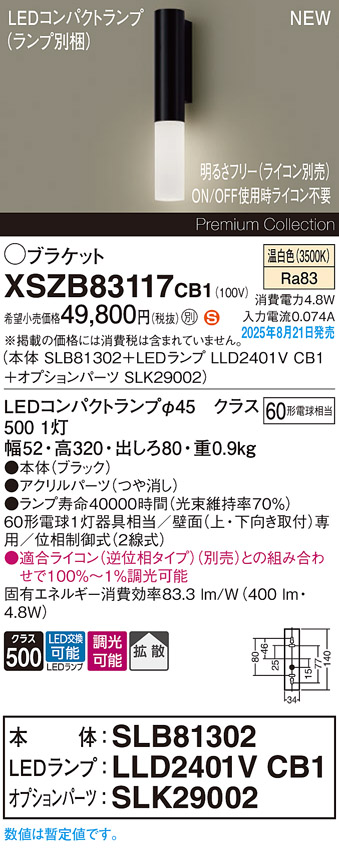パナソニック XSZB83117CB1(ランプ別梱) ブラケット 調光(ライコン別売) LED(温白色) 壁直付型 拡散タイプ LEDコンパクトランプ交換型 ブラック