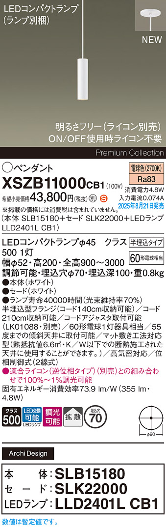 パナソニック XSZB11000CB1(ランプ別梱) ペンダント 調光(ライコン別売) LED(電球色) 天井半埋込吊下型 拡散タイプ LEDコンパクトランプ交換型 ホワイト