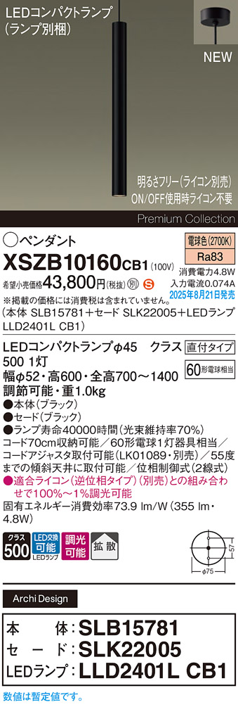 パナソニック XSZB10160CB1(ランプ別梱) ペンダント 調光(ライコン別売) LED(電球色) 天井吊下型 拡散タイプ 直付タイプ LEDコンパクトランプ交換型 ブラック