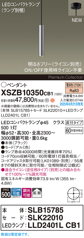 パナソニック XSZB10350CB1(ランプ別梱) ペンダント 調光(ライコン別売) LED(電球色) 天井吊下型 拡散タイプ 直付タイプ LEDコンパクトランプ交換型 アルミ色 [戻る]
