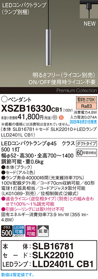 パナソニック XSZB16330CB1(ランプ別梱) ペンダント 調光(ライコン別売) LED(電球色) 配線ダクト取付型 拡散タイプ LEDコンパクトランプ交換型