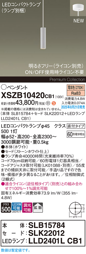 パナソニック XSZB10420CB1(ランプ別梱) ペンダント 調光 ライコン別売 LED 電球色 天井吊下型 拡散 直付タイプ LEDコンパクトランプ交換型 ストーンホワイト