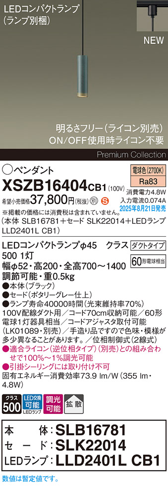 パナソニック XSZB16404CB1(ランプ別梱) ペンダント 調光(ライコン別売) LED(電球色) 配線ダクト取付型 拡散タイプ LEDコンパクトランプ交換型 ポタリーグレー [戻る]