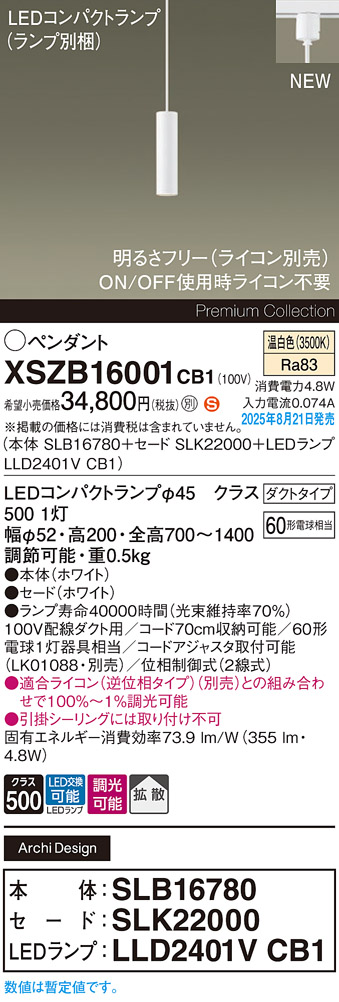 パナソニック XSZB16001CB1(ランプ別梱) ペンダント 調光(ライコン別売) LED(温白色) 配線ダクト取付型 拡散タイプ LEDコンパクトランプ交換型 ホワイト