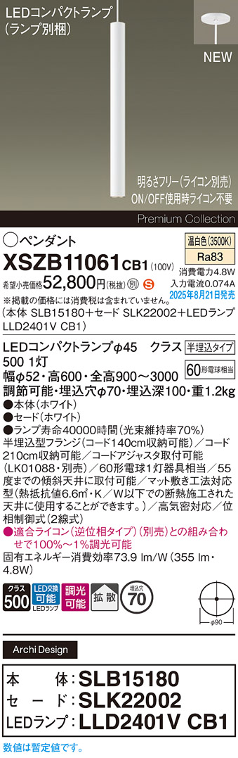 パナソニック XSZB11061CB1(ランプ別梱) ペンダント 調光(ライコン別売) LED(温白色) 天井半埋込吊下型 拡散タイプ LEDコンパクトランプ交換型 ホワイト