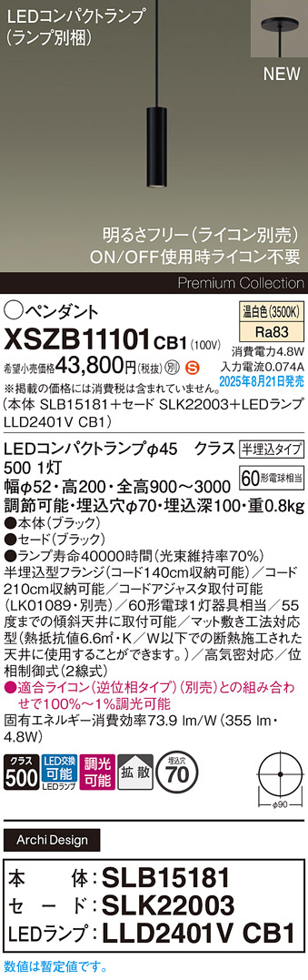 パナソニック XSZB11101CB1(ランプ別梱) ペンダント 調光(ライコン別売) LED(温白色) 天井半埋込吊下型 拡散タイプ LEDコンパクトランプ交換型 ブラック