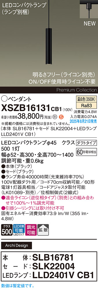 パナソニック XSZB16131CB1(ランプ別梱) ペンダント 調光(ライコン別売) LED(温白色) 配線ダクト取付型 拡散タイプ LEDコンパクトランプ交換型 ブラック
