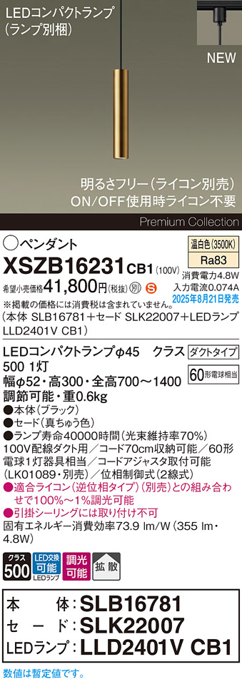 パナソニック XSZB16231CB1(ランプ別梱) ペンダント 調光(ライコン別売) LED(温白色) 配線ダクト取付型 拡散タイプ LEDコンパクトランプ交換型 真ちゅう色 [戻る]