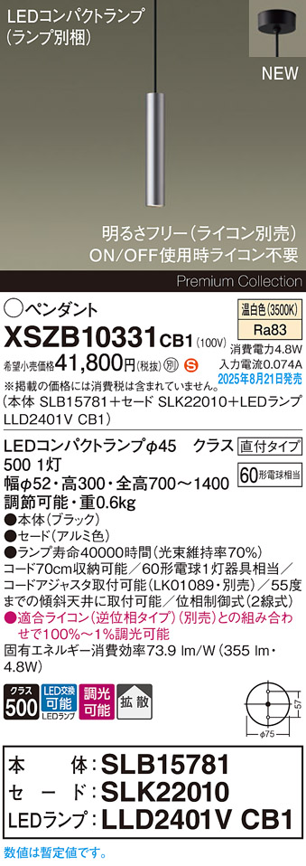 パナソニック XSZB10331CB1(ランプ別梱) ペンダント 調光(ライコン別売) LED(温白色) 天井吊下型 拡散タイプ 直付タイプ LEDコンパクトランプ交換型 アルミ色