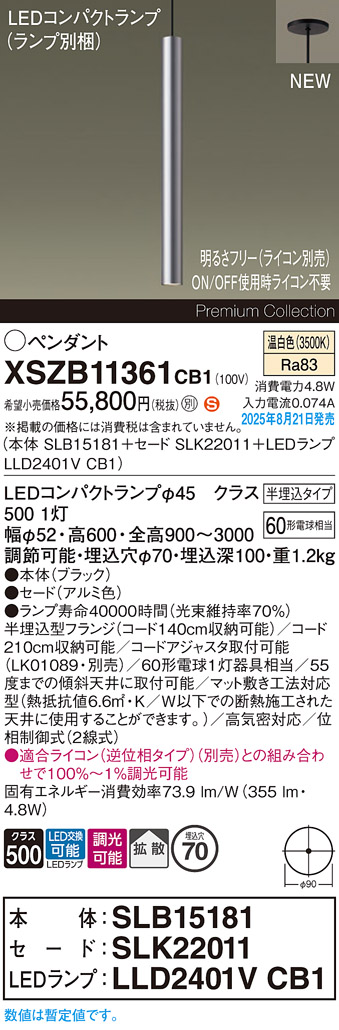 パナソニック XSZB11361CB1(ランプ別梱) ペンダント 調光(ライコン別売) LED(温白色) 天井半埋込吊下型 拡散タイプ LEDコンパクトランプ交換型 アルミ色
